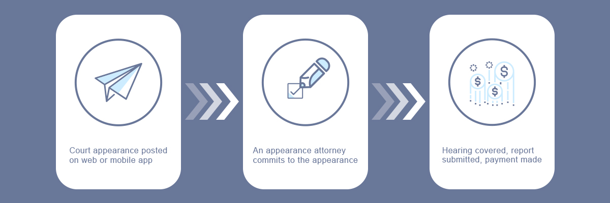 AppearMe is an automated portal. This special appearance app is built on an interface where registered attorneys get matched through a Web and mobile application(iOS and Android). Once registered you can post and receive as many job offers as you wish. All is done through an automated interface with minimum manual effort.