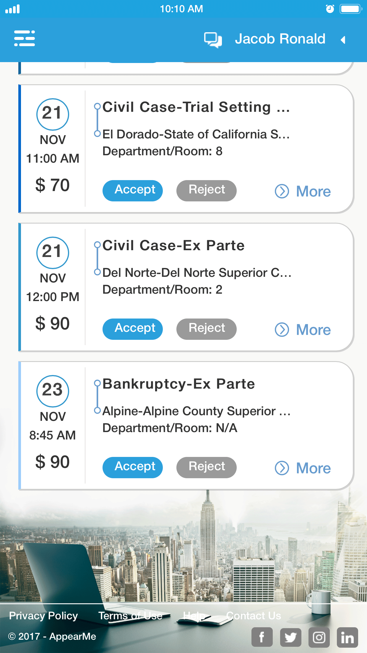 AppearMe is a web and mobile application that helps you find appearance attorneys in real-time. Once you create a case, hundreds of appearance attorneys get a chance to appear for you.